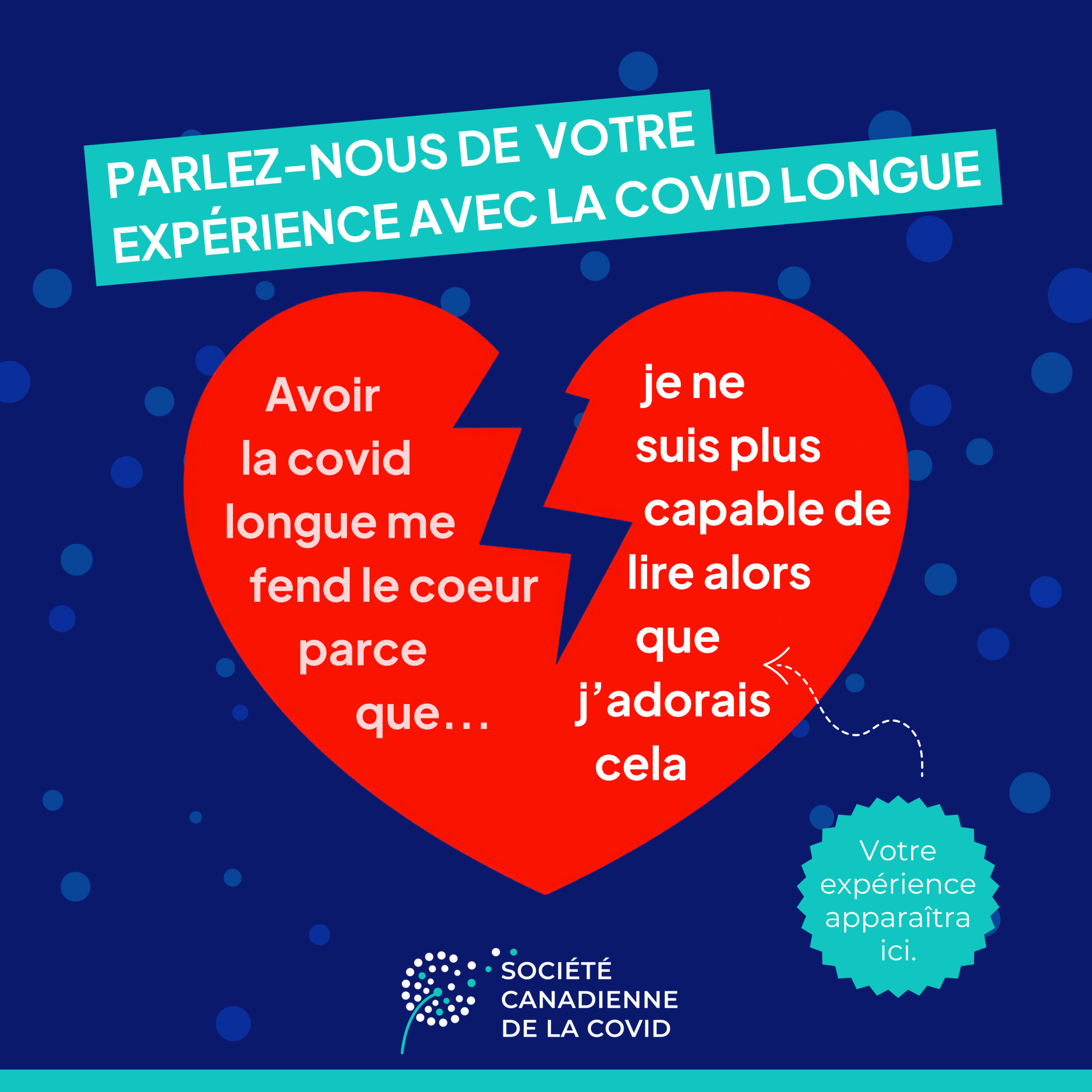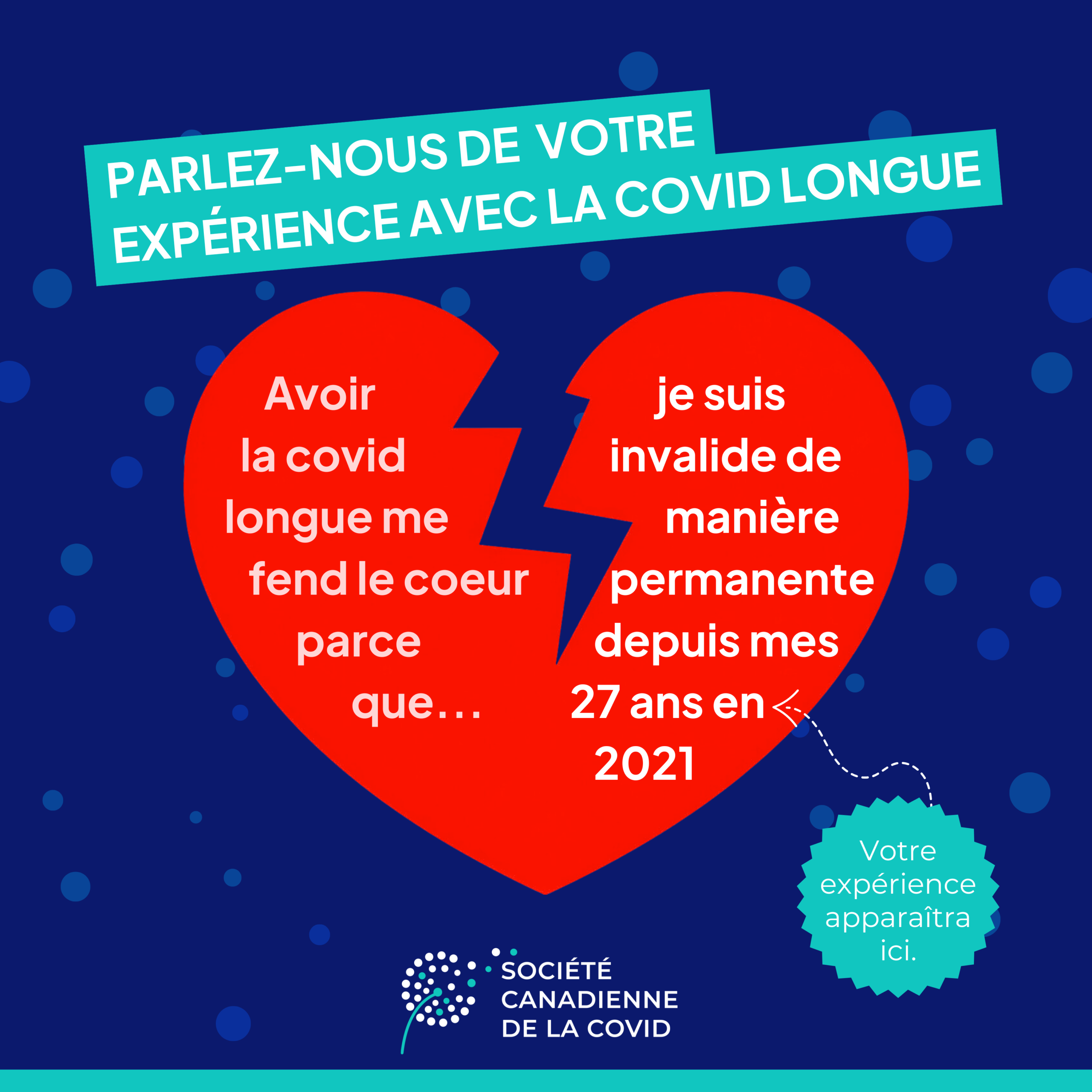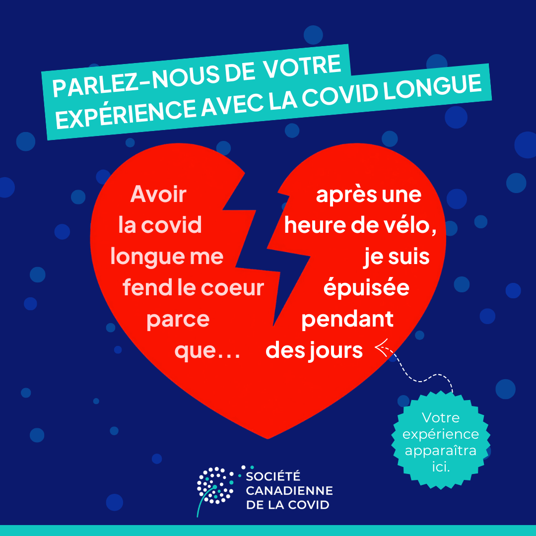 Lors de ces événements, des banderoles mettront en lumière la perspective de personnes atteintes de la covid longue partout au pays, présentée à l’aide d’un visuel immédiatement reconnaissable : un cœur brisé. Ce symbole de perte et de deuil illustre l’ampleur des répercussions de la covid longue sur la vie de tant de personnes, et nous espérons qu’il saura interpeller le public avec force.